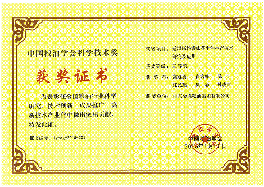The production technology of temperature-appropriate pressed aroma peanut oil (also known as "original virgin peanut oil") was independently developed by Jinsheng Group. The R&D and production process brought together a number of new national patent technologies, which fully reflects the impact of scientific and technological progress on the production technology of strong aroma pressed peanut oil. Supporting effect. This is another new breakthrough in technological innovation for Jinsheng Group after winning the second prize of Shandong Province Science and Technology Progress Award in 2014 and the third prize of Shandong Province Science and Technology Progress Award in early 2016.
