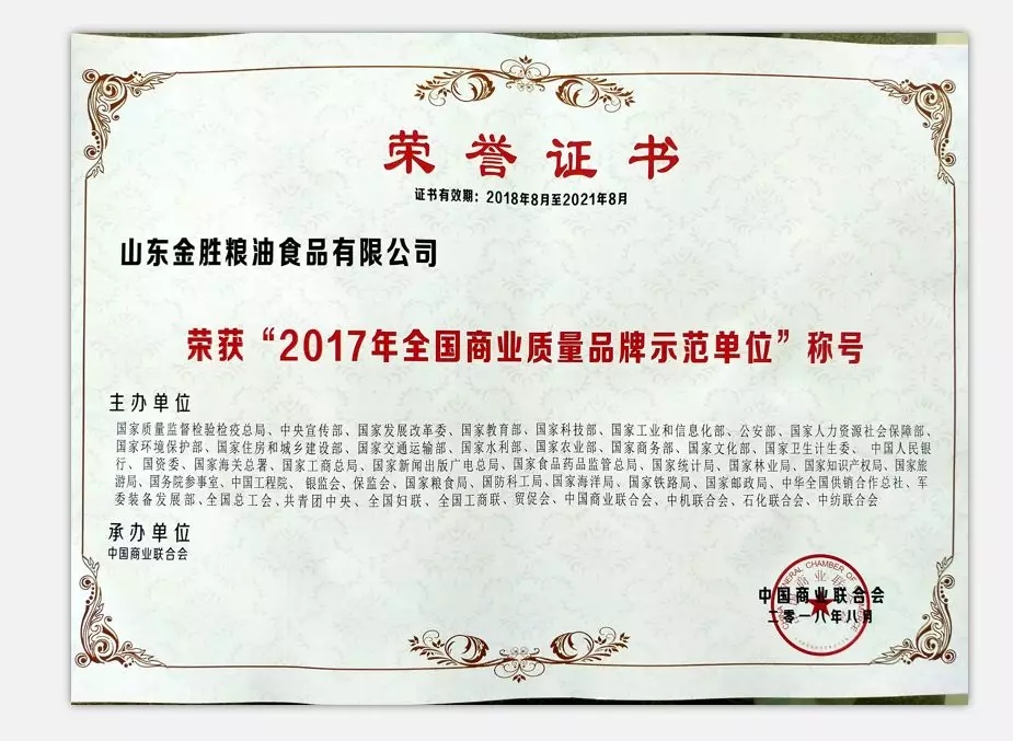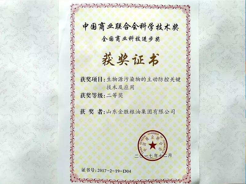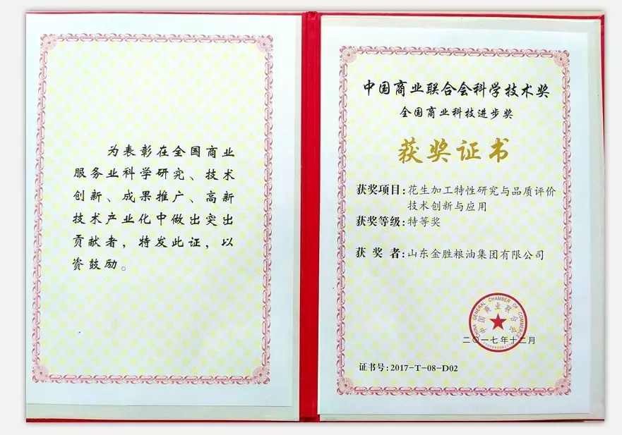 Chen Ning, director of the R&D center, attended the meeting on behalf of the company. The "Technological Innovation and Application of Peanut Processing Characteristics Research and Quality Evaluation" jointly applied by Jinsheng Group and the Chinese Academy of Agricultural Sciences won the National Commercial Science and Technology Progress Special Award, and the "Key Technologies and Applications of Active Prevention and Control of Biological Pollutants" jointly applied by Jinsheng Group and Jiangnan University won the second prize of the National Commercial Science and Technology Progress Award, and the group's subsidiary Shandong Jinsheng Cereals, Oils and Food Co., Ltd. won the "2017 National Commercial Quality Brand Demonstration Unit".