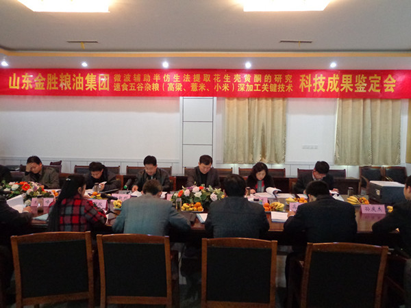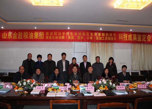 2012年12月29日,受山東省科技廳委托,臨沂市科技局組織相關專家對我公司和青島農業(yè)大學共同完成的“微波輔助半仿生法提取花生殼黃酮”和“速食五谷雜糧(高粱、薏米、小米)深加工關鍵技術”兩個項目進行了科技成果鑒定。與會的七位專家分別來自山東省農業(yè)科學院、中國海洋大學、山東農業(yè)大學、山東輕工業(yè)學院、日照職業(yè)學院。參加本次鑒定會的市縣領導有市科技局成果科科長付艷玫、市科技局成果科副科長黃衛(wèi)平、縣科技局局長劉建峰、縣科技局副局長徐淑嶺和縣局唐寬飛、李曉云兩位科長。我公司總經理高冠勇、副總經理崔言峰、研發(fā)中心主任陳寧參加了鑒定會。青島農業(yè)大學副院長孫慶杰教授代表我公司對兩個項目進行了匯報,與會專家聽取了課題組的匯報,審查了相關資料,通過質詢、討論,分別形成如下鑒定意見: